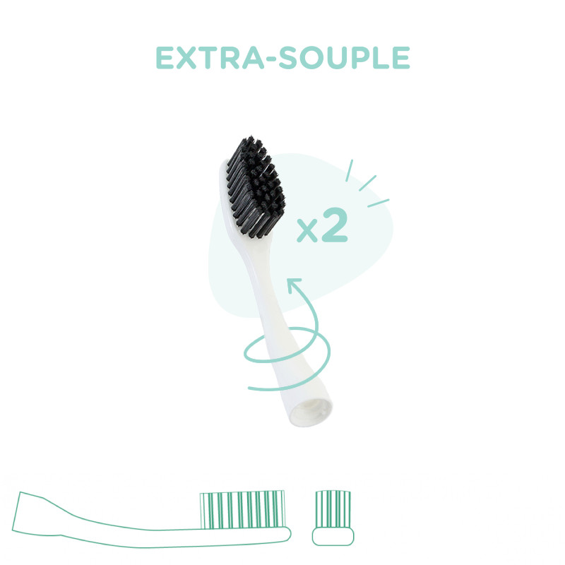 Étui de 2 têtes de recharge pour le manche Édith. En plastique recyclé, elles permettent de ne renouveler que 20% du poids de la brosse à dents. Les filaments sont en nylon à base végétale.