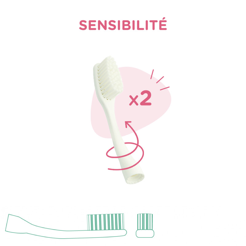 Étui de 2 têtes de recharge pour le manche Édith. En plastique recyclé, elles permettent de ne renouveler que 20% du poids de la brosse à dents. Les filaments sont en nylon à base végétale.